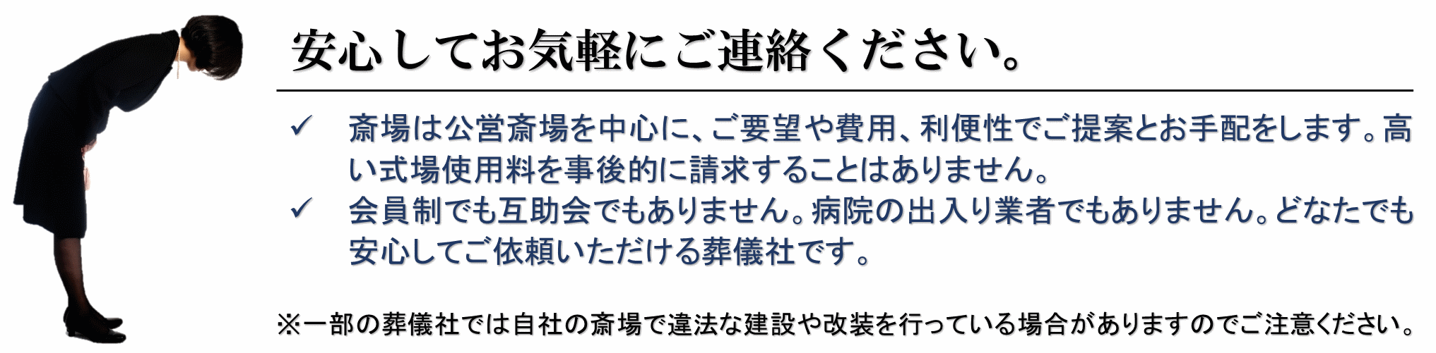 一般葬プラン 誇大広告にお気を付けください “追加料金一切不要”とありながら通夜の料理が含まれていない・・・、そういうことは当社ではありません。 後から「備品の料金」「霊柩車の料金」「寝台車の料金」「位牌の料金」「供物の料金」は別に請求される・・・、こういうことがないので安心です。 比較して当社を選ばれる方が多いのは、「見積もりにきちんと内容の全てが書かれているから信用できた」・「比較すると結局こちらが一番安い」という理由です。 お急ぎでも、ご相談でもお気軽にお電話下さい 050-3126-5179 24時間年中無休・深夜早朝でも お見積り問い合わせ